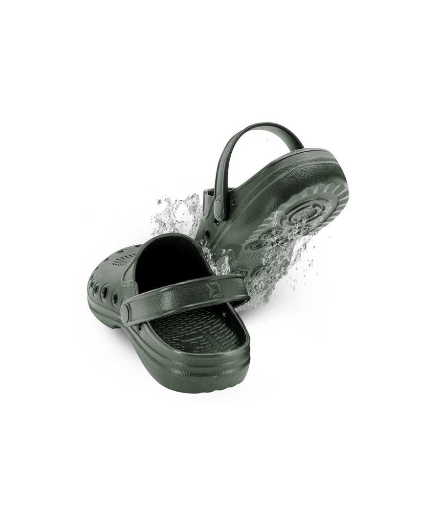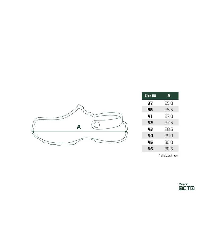 Ďalším sofistikovaným prvkom sú veľké postranné otvory, ktorých prioritnou úlohou je starať sa o odvetrávanie a celkovú vzdušnosť v tejto obuvi. Zámerne nie sú navrhnuté vo výške podrážky, ako to býva štandardom, ale o niečo vyššie. Práve tento detail zohráva významnú úlohu počas pobytu na brehu, či plytkej vode. Tým, že otvory sú o niečo vyššie nad vnútornou stielkou je takmer eliminované nechcené naberanie piesku či kamienkov medzi podrážku a chodilo. Vaše chodidlá sú teda chránené v maximálnej možnej miere. Okrem týchto otvorov slúži na odvetrávanie hustá perforácia umiestnená vo vrchnej časti. Tá je zámerne vytvarovaná na jednej strane do symbolu D z loga Delphin, na druhej vsuvke zase kraľuje symbol O, ako počiatočné písmeno názvu OCTO. Celkový dojem ešte zhodnocuje jemná štruktúra na povrchu šľapiek, ktorá evokuje kožu chobotnice. Vďaka použitému EVA materiálu sú mimoriadne ľahké, húževnaté a dokonca plávajúce. Samozrejmosťou je u tohto modelu popruh na fixáciu päty (ľudovo nazývané aj uzávierka), ktorý oceníte najmä v nerovnom, či svahovitejšom teréne.