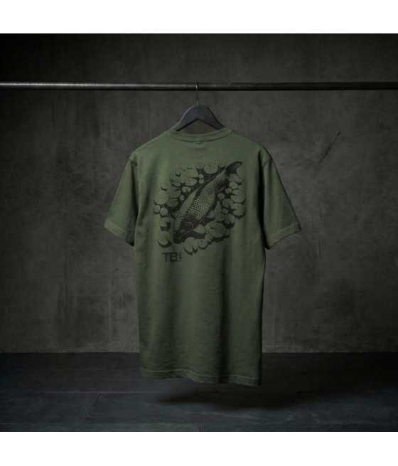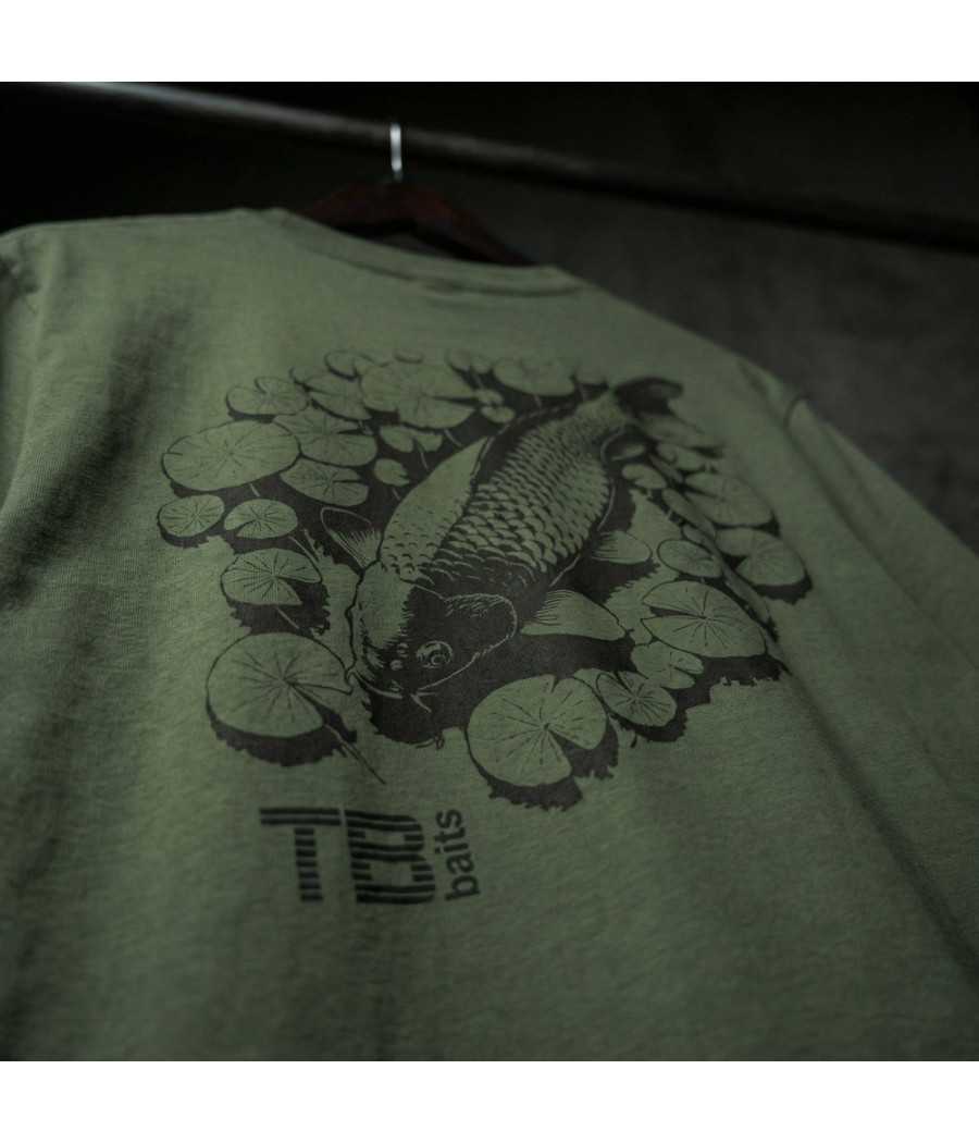 Kvalitné unisex tričko TB Baits v edícii Hidden Carp v prémiovej zelenej farbe s výrazným motívom na chrbte.